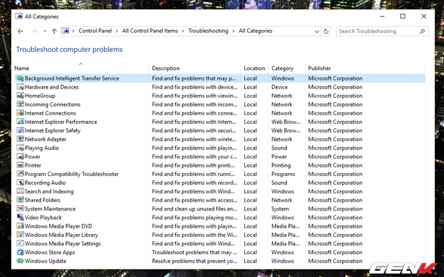 Khi đó Windows sẽ hiển thị lên danh sách đầy đủ các công cụ chuẩn đoán và khắc phục các vấn đề mà Troubleshoot trên Windows cung cấp sẵn cho bạn.